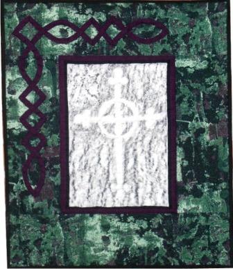 The center panel is a rubbing that I took from a headstone in the cemetery surrounding her church. I surrounded it with the mossiest fabric I could find and then added some Celtic appliqué done with stripes on the bias.