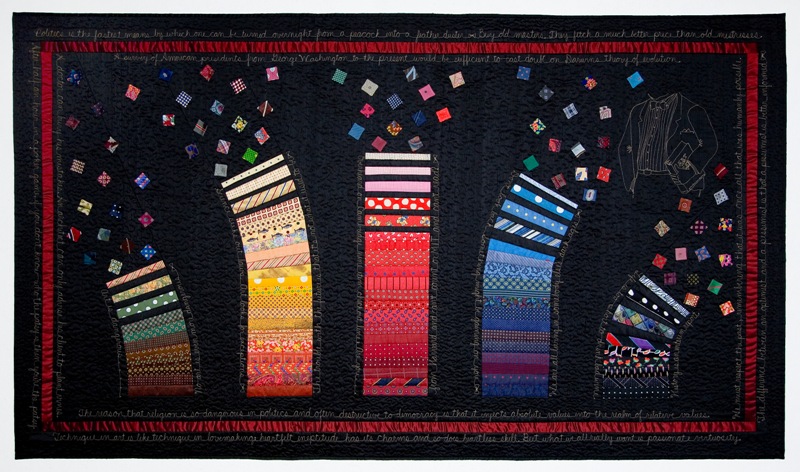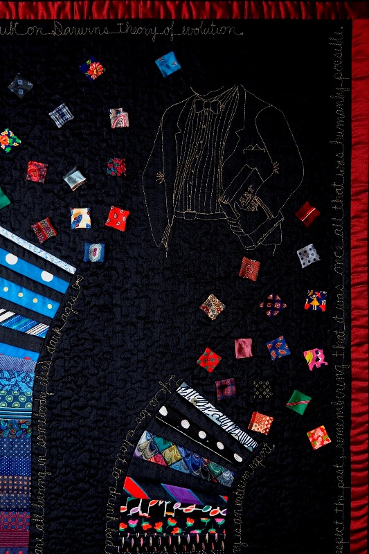 This tribute quilt was designed to honor a man who was very active in the art world. Among other things, he was known for his bow ties and the collection of quotes on his office bulletin board. The black dupioni silk in the background and the red silk in the narrow border are the only fabrics I added. The rest is all bow tie fabric from his collection of 166 bow ties.