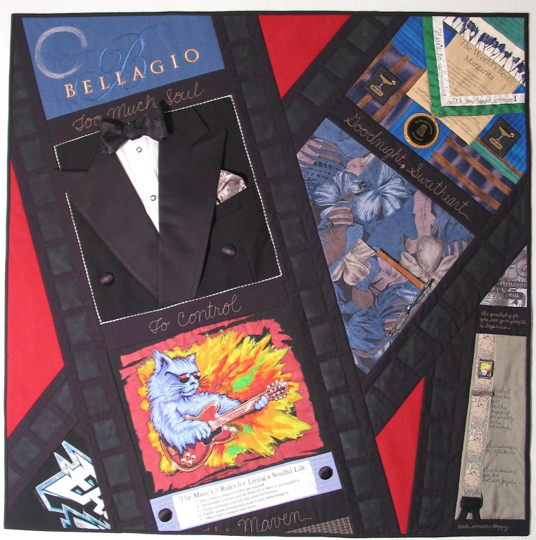 This commission quilt is a tribute to a client’s late husband. In it, I incorporated some of his most beloved clothing and belongings. The movie theme was a nod to their shared love of films and the film industry.